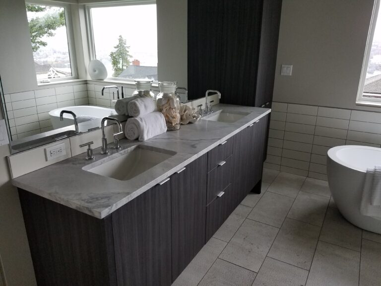 No matter which material you choose, stone countertops bring elegance and sophistication to any bathroom space. Stone is also heat-resistant and is less likely to warp or discolor with age, so it will maintain its original beauty for years to come. In addition, stone is an excellent choice for bathrooms because it is non-porous, meaning it won’t trap dirt or bacteria, making it easy to clean.